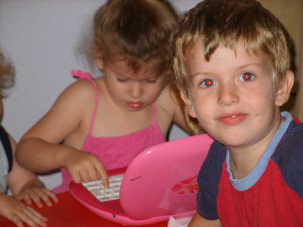 Melody plays with her new "computer" toy with Matthew always looking on