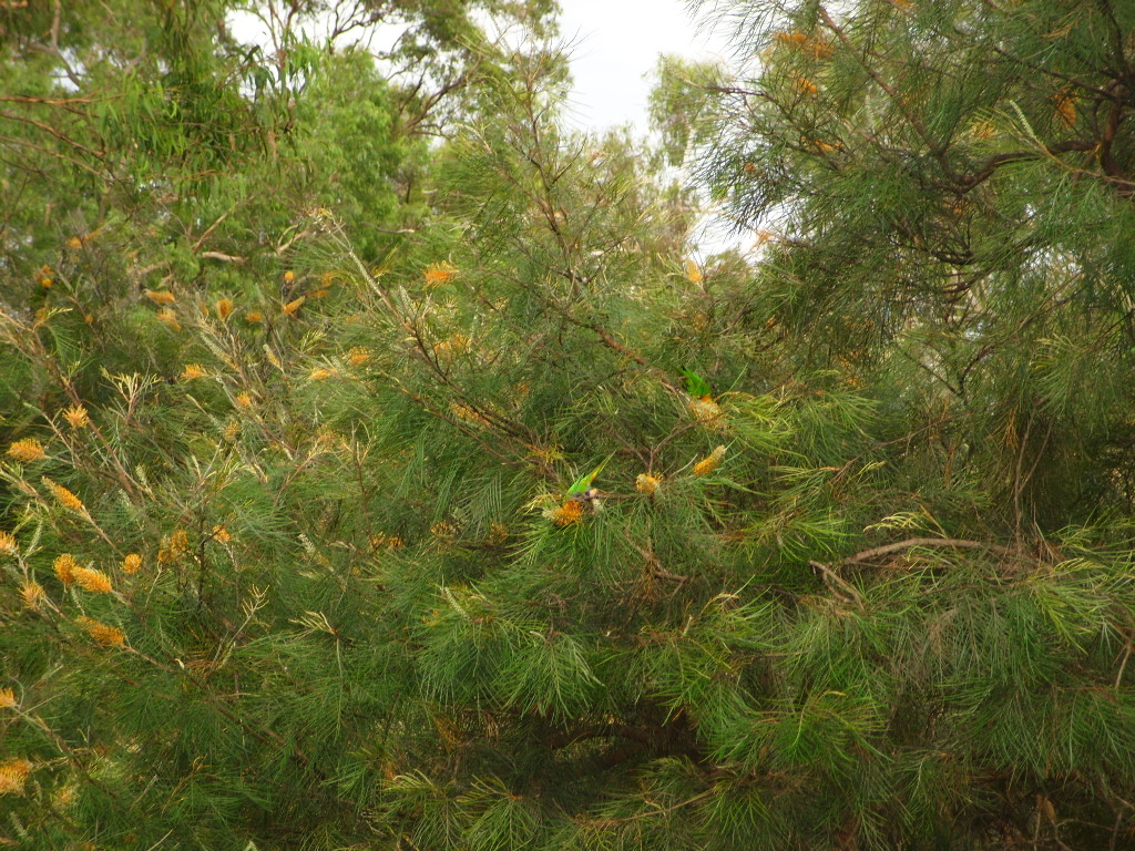 Parrot (look carefully in middle of picture) on Joel's bottle brush (their favorite food)