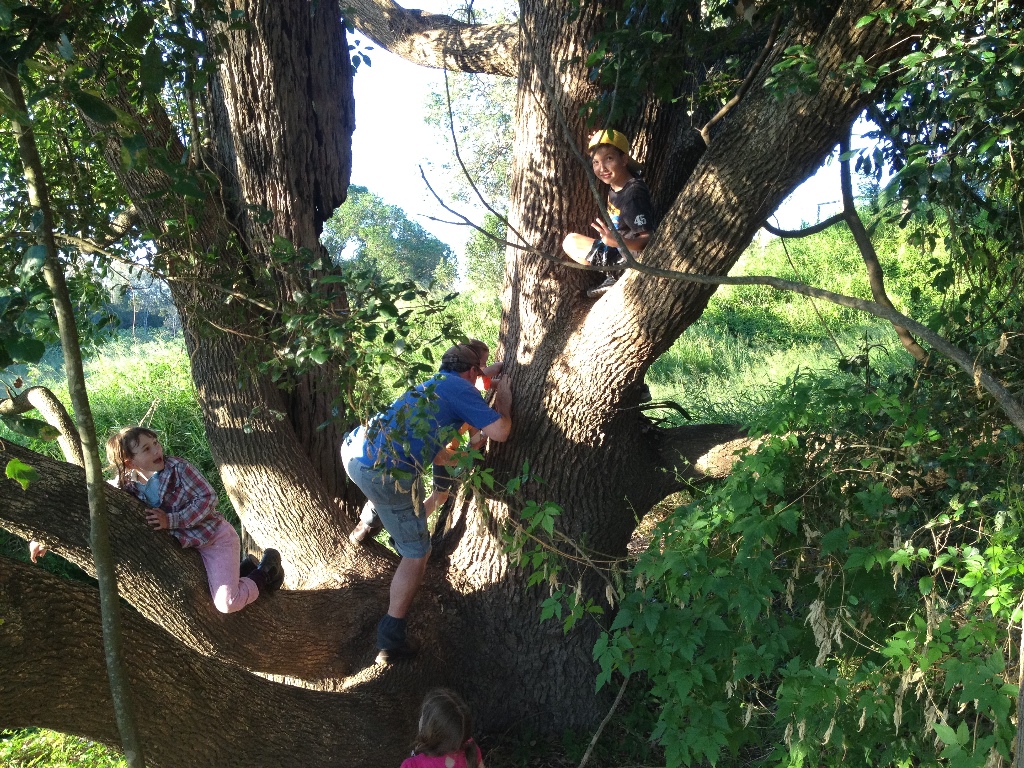 Climbing tree by the Logon River on the TIms' farm - long low branches!