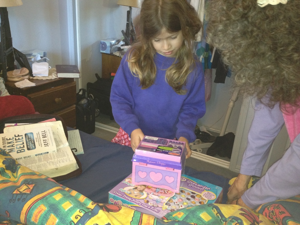 Melody with "late" Christmas presents from Laura (found then in the closet)