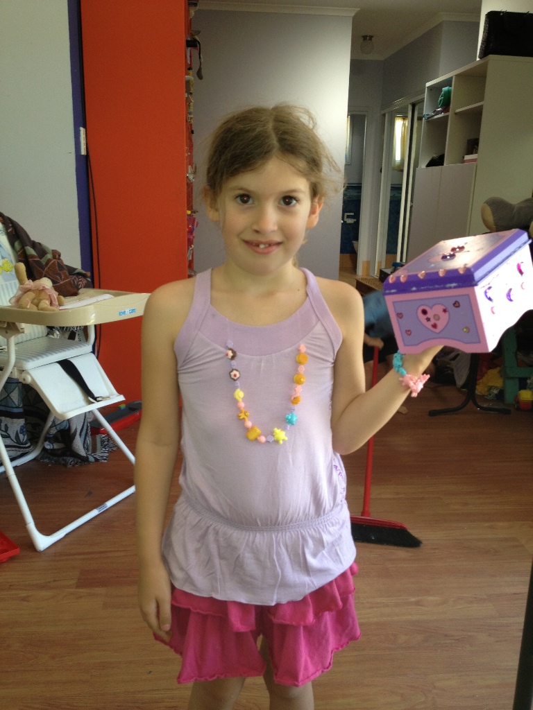 Melody with the jewelry box decorated - with a necklace and bracelet she made with Gramps