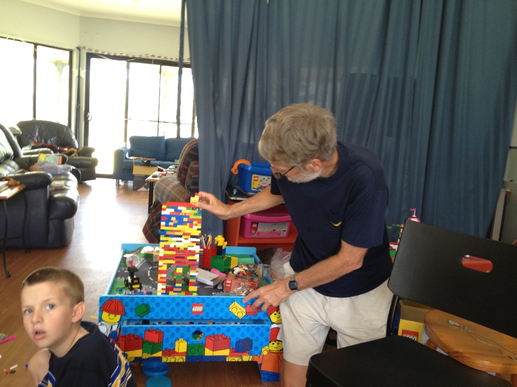 Building a tall Lego building with the big box of pieces
