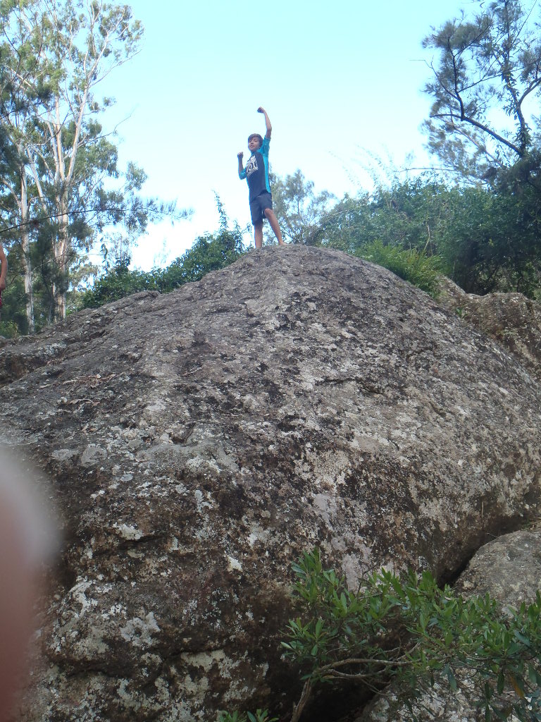 But no signs here! Maxwell on a 20 ft high rock by the creek.