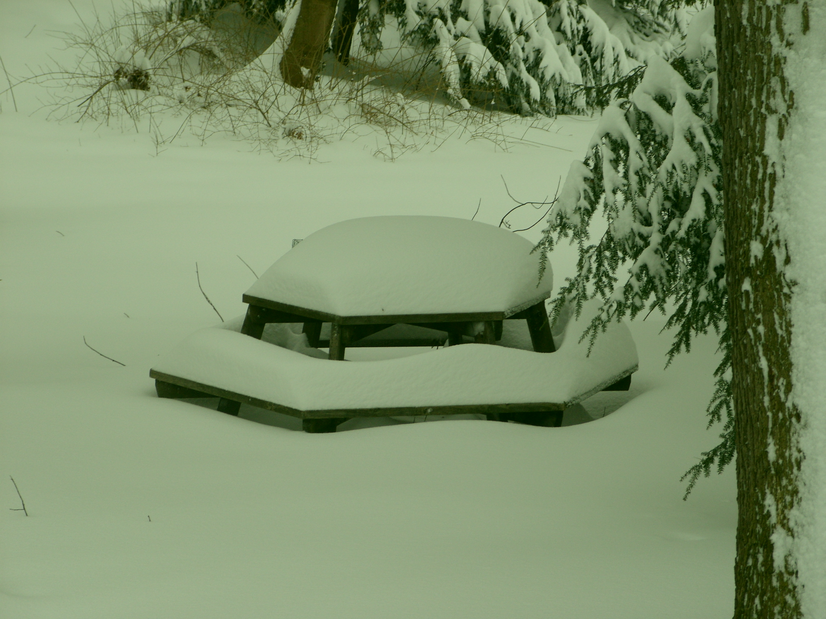 The snow is up to the seats of the picnic table.