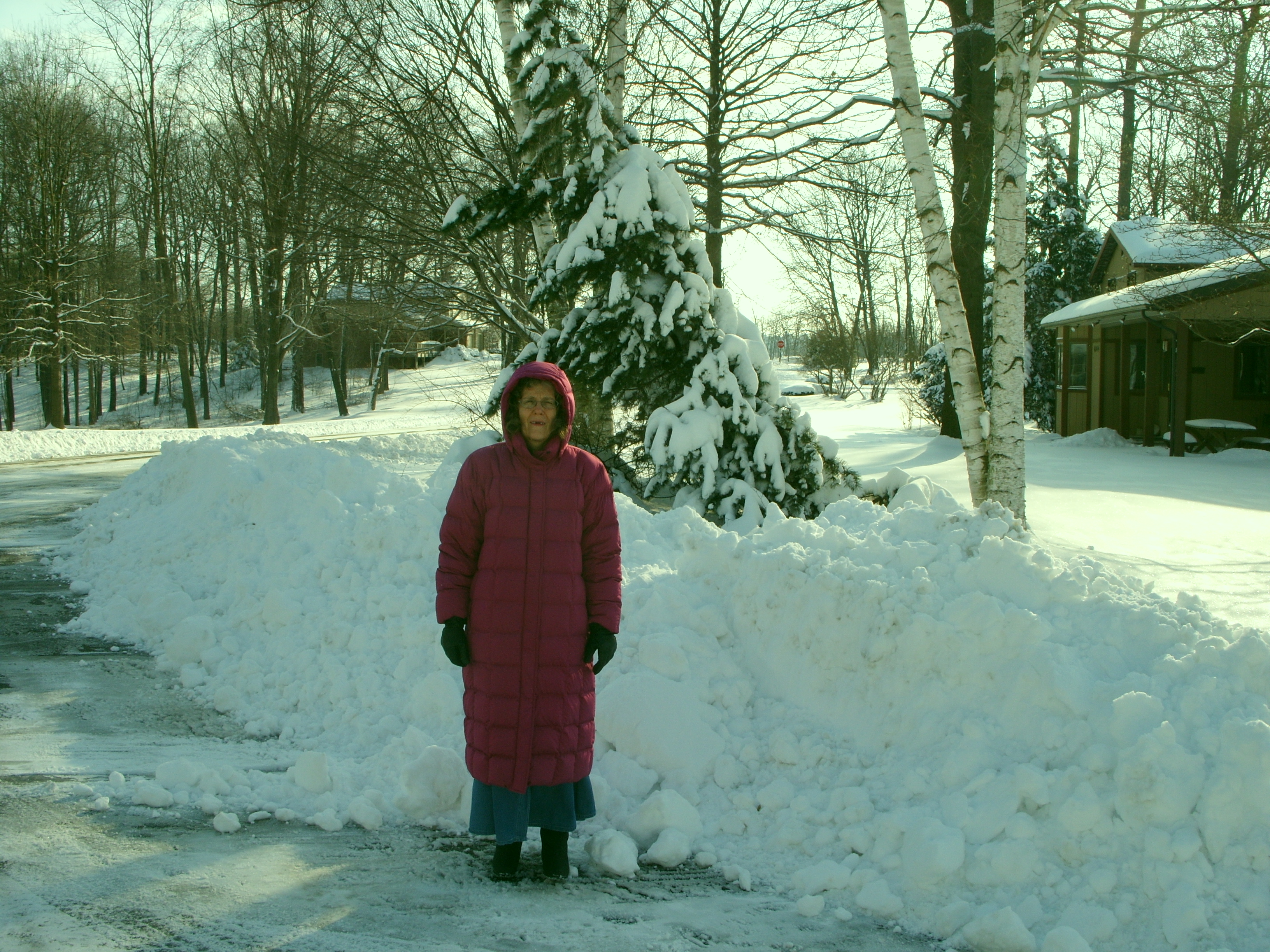 The big pile at the corner and pine trees under the load of snow.