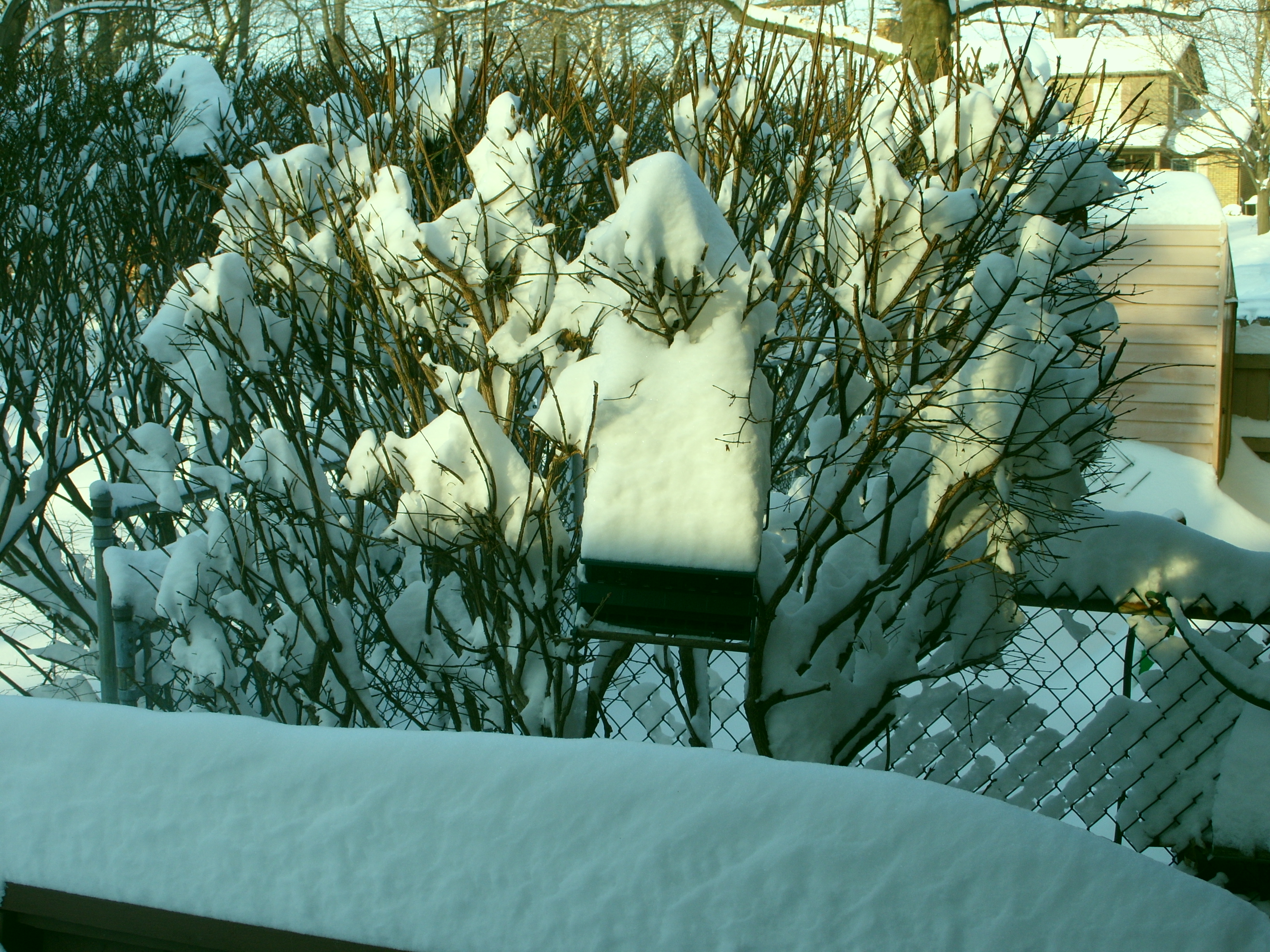 The bird feeder is in the middle of the picture with its high hat of snow!
